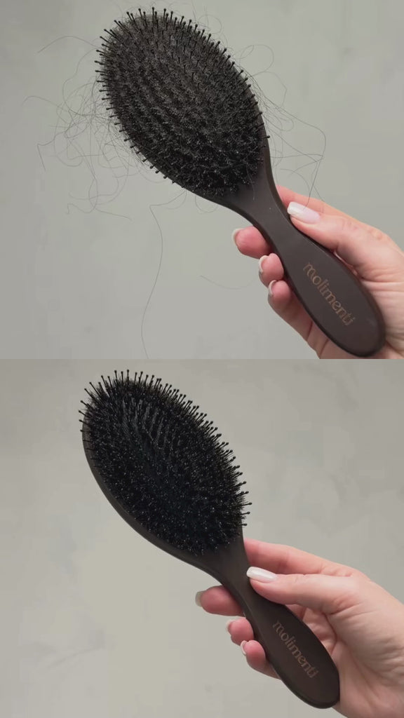 – One side with soft, malleable bristles that clear the brush of hair